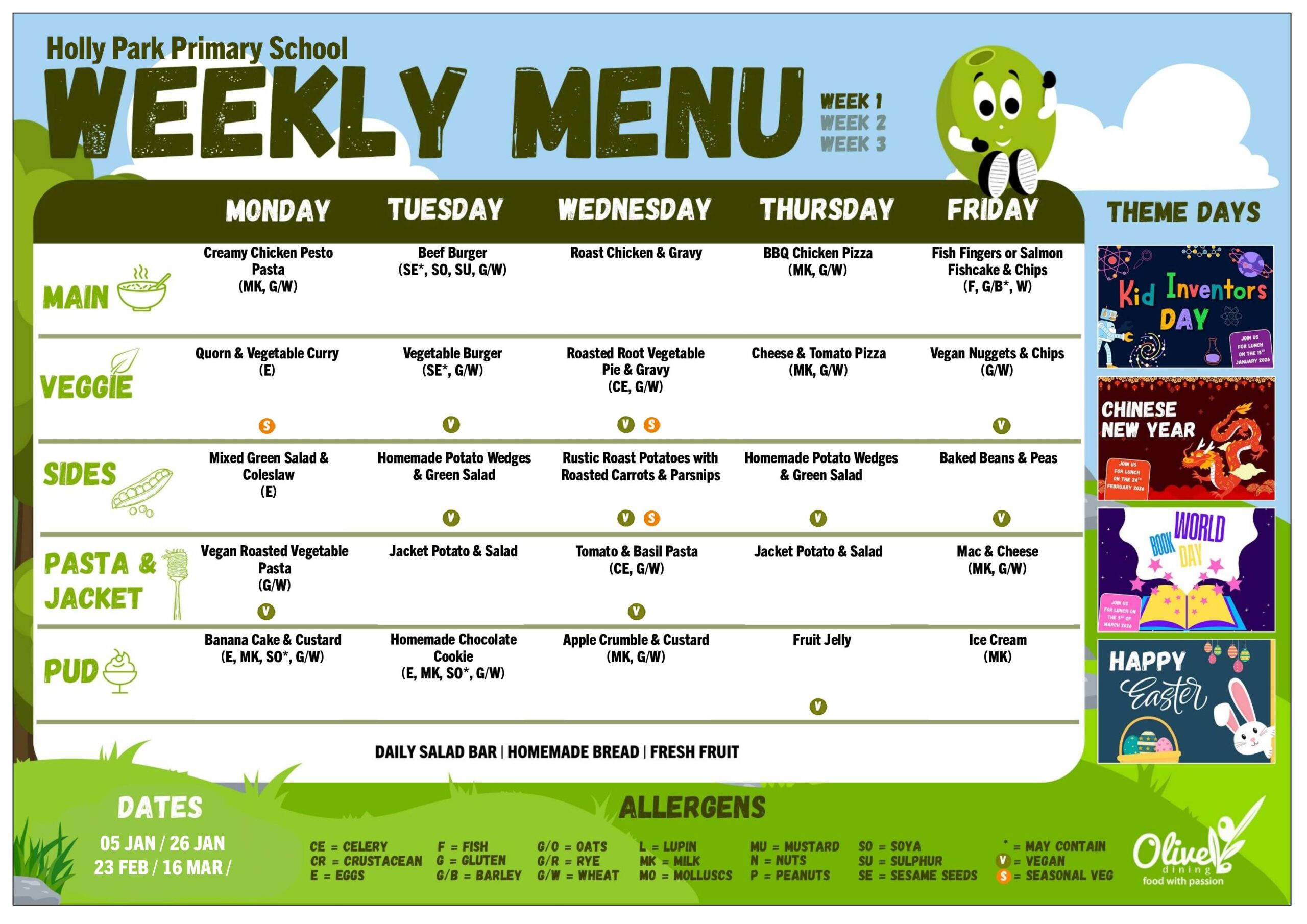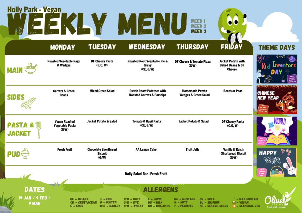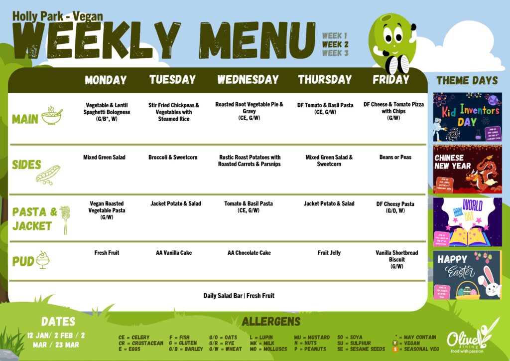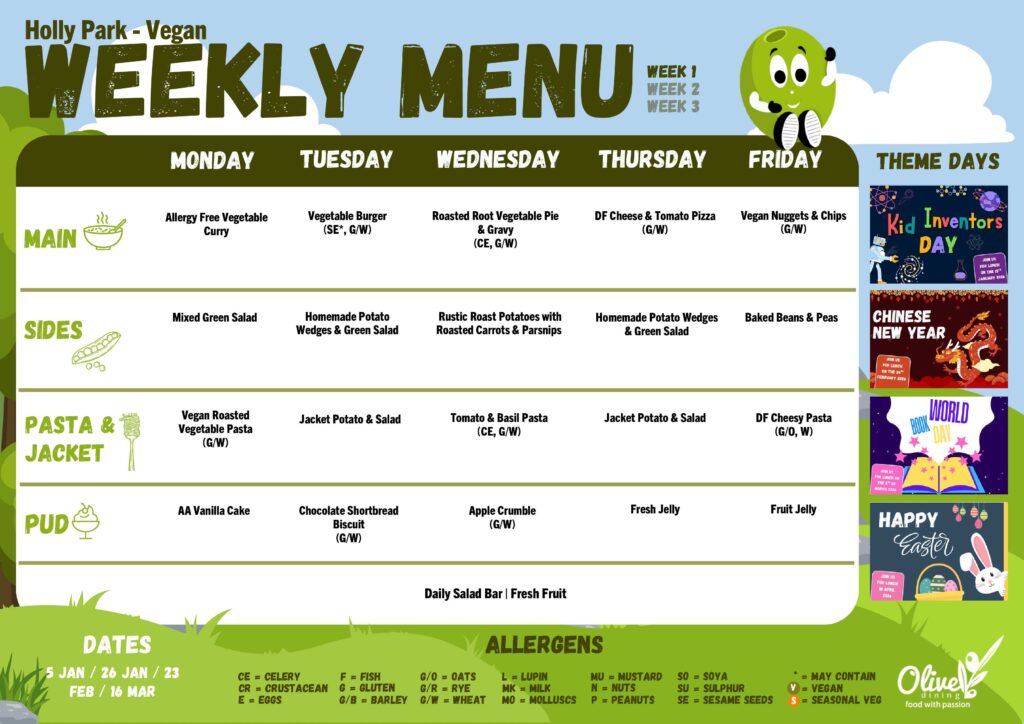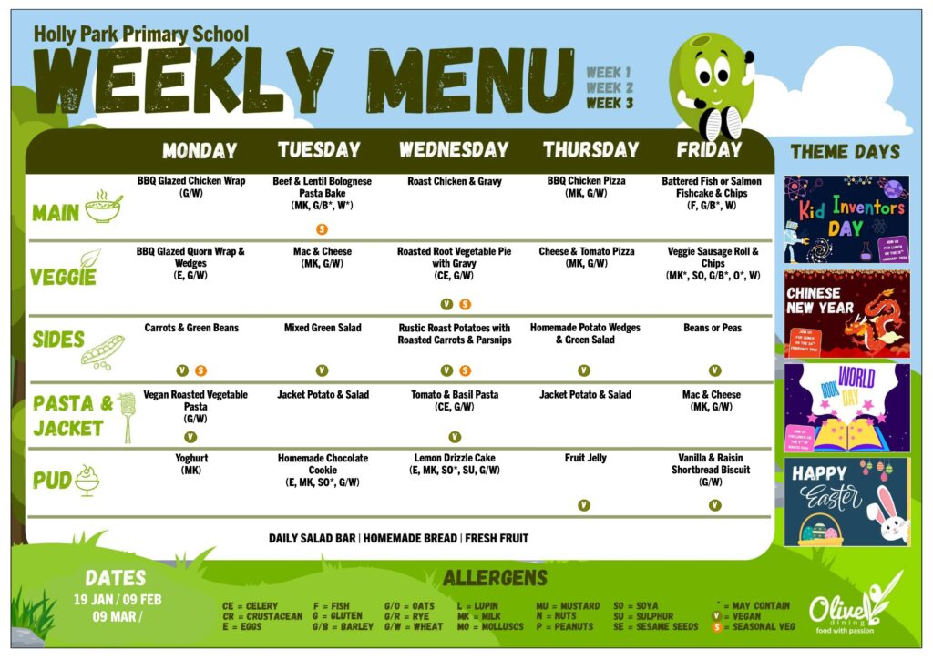 Every effort is made to keep to the menu for the week, but due to delivery problems or swaps made by the supplier changes may occur. This is out of the control of both the kitchen and the school.