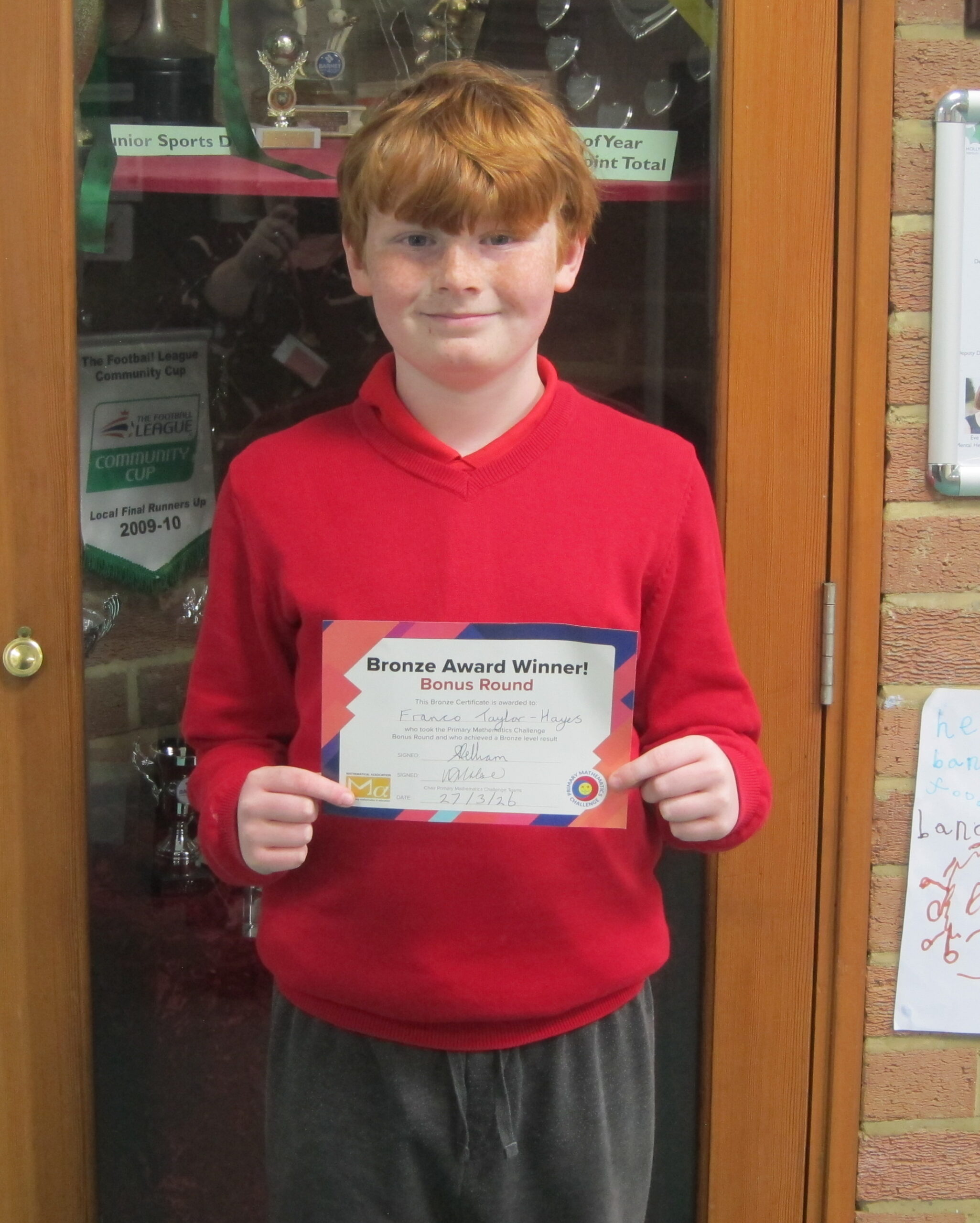 This year we took part in the National Primary Maths Challenge. Several children from Years 4 to 6 took part in the first round. Franco from Year 6 got through to the second round. This is an even harder mathematical test taken by children across the country. We found out just before the holiday that Franco was awarded a bronze Certificate of Achievement. A fantastic result – huge congratulations to Franco!